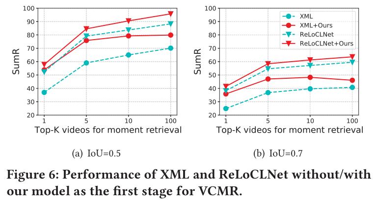 VCMR 任务旨在给定查询文本后,在视频库中检索出对应视频,并且确定查询文本在对应视频中的起止时刻。当前用于 VCMR 任务的主流模型通常拥有两个阶段的工作流程。第一阶段为从视频库中检索出 k 个候选视频,第二阶段为从候选视频中检索出准确的起止时刻。作者选取了当前性能较高的模型,XML 和ReLoCLNet,将以上两个模型在 TVR 数据集上的第一阶段检索结果替换为作者所提出模型的检索结果,从下图可以看出在进行替换后能给上述两模型带来 VCMR 任务上的性能提升。