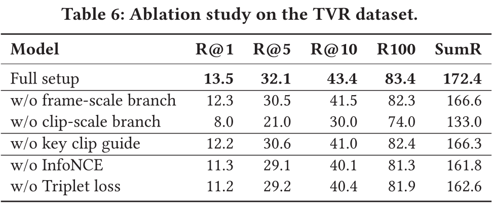对于提出的多尺度多示例模型的不同组成部分,作者进行了消融分析。模型单独使用帧尺度或片段尺度特征表示分支时,性能都不如两分支相结合。同时基于关键片段的注意力机制也能为模型带来较大的性能提升。由于在模型训练阶段同时使用了三元组损失和对比学习损失,作者也对两损失结合使用的有效性进行了论证。
