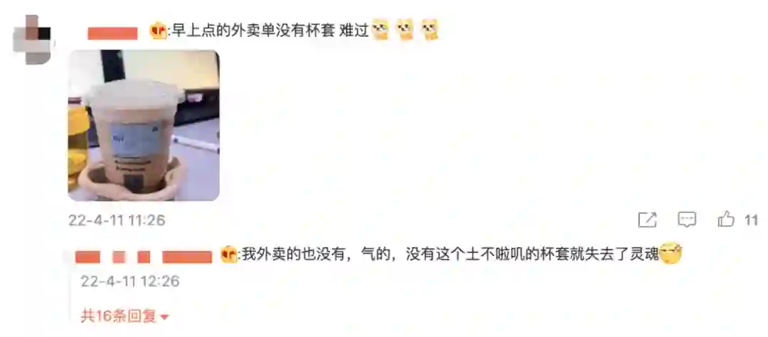有消费者在拿到带有土味杯套的椰云拿铁时,纷纷摆出了与椰树椰汁代言人一致的姿势;不少网友更是对外卖下单没法获得限定杯套感到遗憾,并表示“没有了土味杯套,就失去了灵魂。”