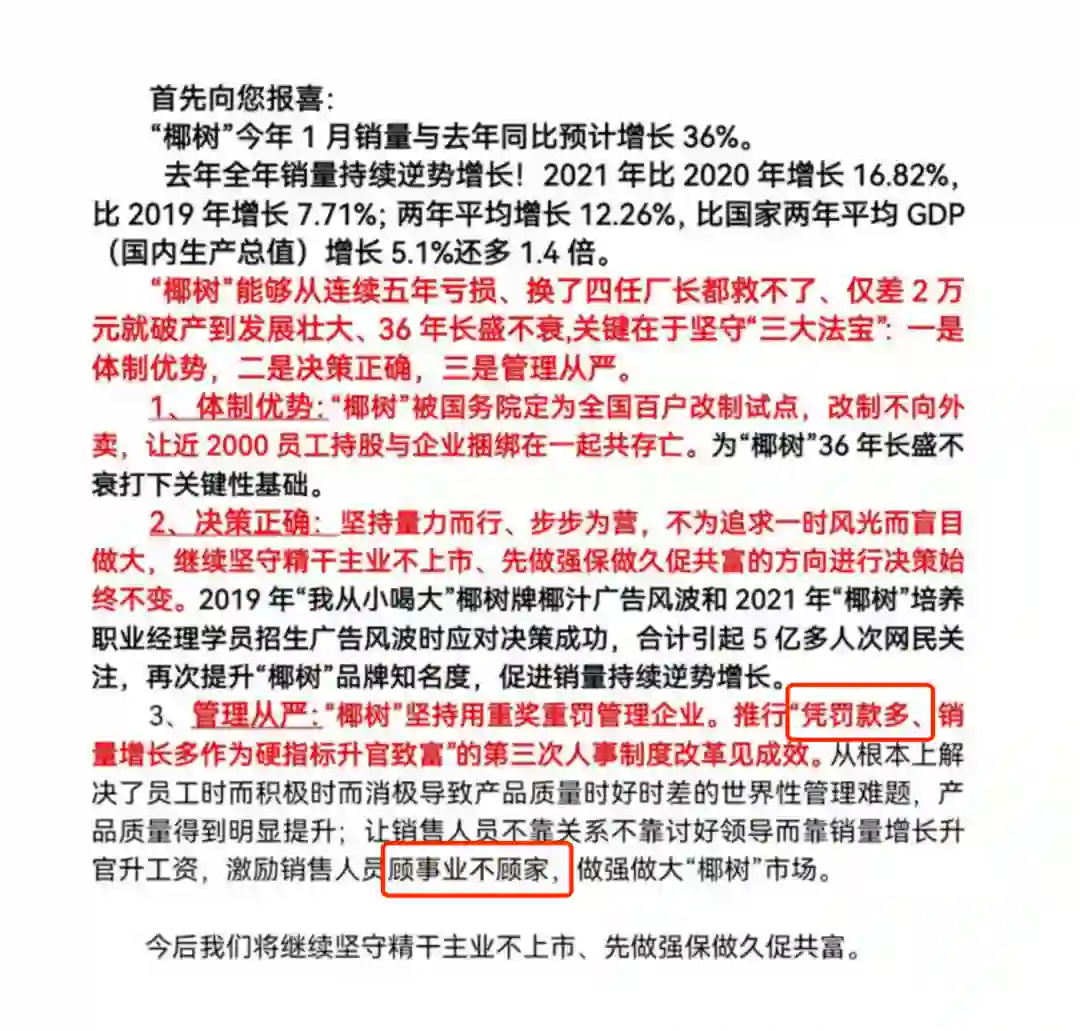 在《开门红报喜》一文中,椰树集团明确提出,集团坚持用重奖重罚管理企业,推行“凭罚款多、销量增长多作为硬指标升官致富”的第三次人事制度改革,由此从根本上解决了“员工时而积极时而消极导致产品质量时好时差”的世界性管理难题,并激励销售人员“顾事业不顾家”。