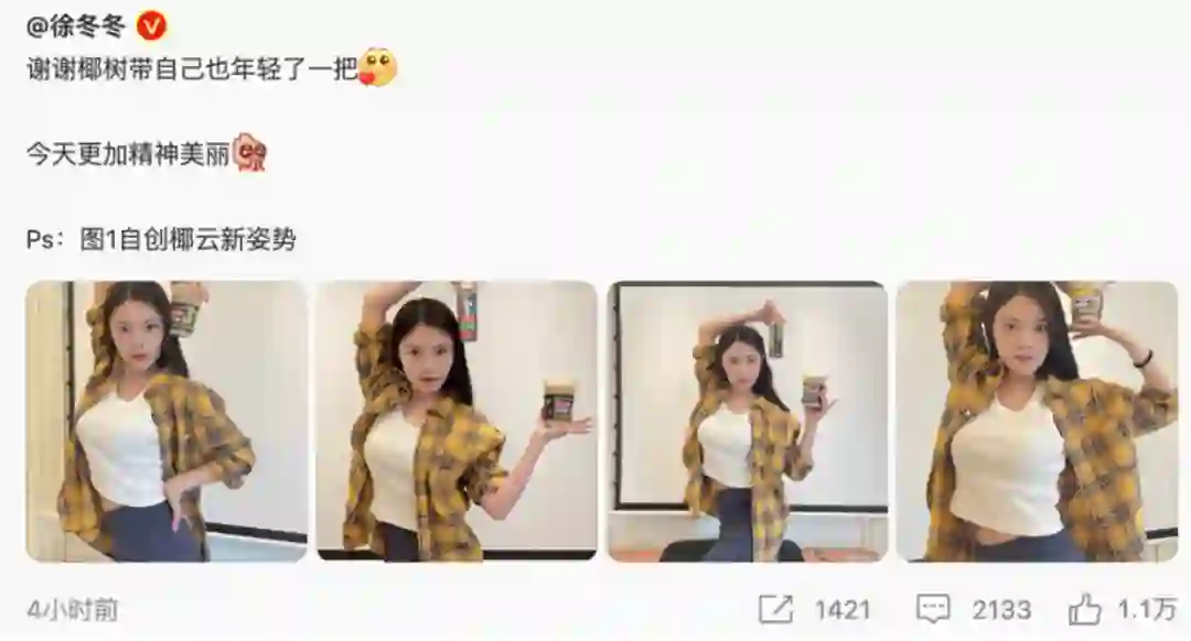 在新品推出当天,瑞幸咖啡更是转发了椰树椰汁代言人徐冬冬手举椰云拿铁的微博,将玩梗发挥到极致。