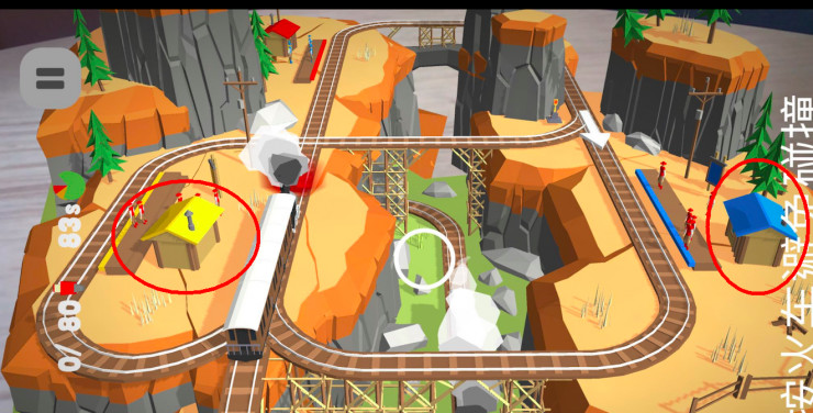 具体怎么玩?上图中画红圈黄色和蓝色小房子的是停站点,也是获取分数的地方,白色冒烟的是火车,尽量让火车在两个站点处停车。