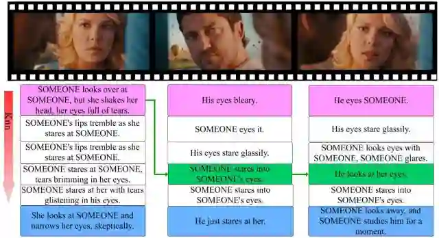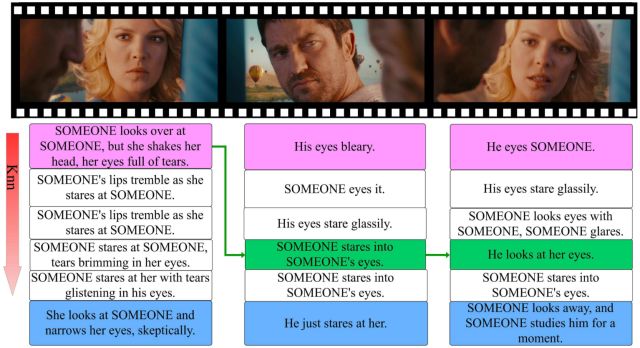 Fig. 1 对于给定视频序列(顶部),我们寻找最相近的带有语义信息的参考视频片段(clip)。我们的方法不仅确保给测试的视频片段寻找最匹配的语义信息(从5个选项中匹配最合适该片段的语义信息),并且保留了时间相关性(绿色路径)。蓝色部分是Ground truth。