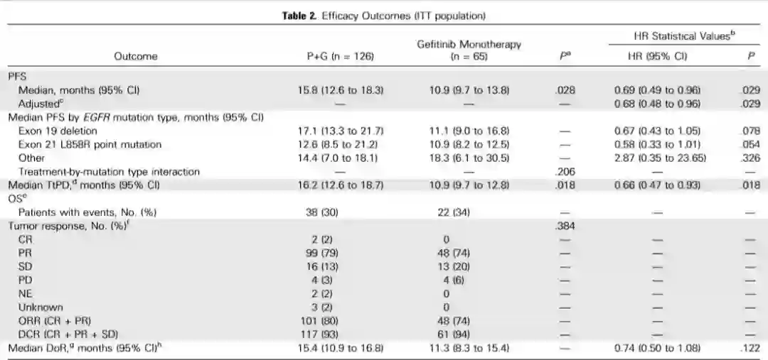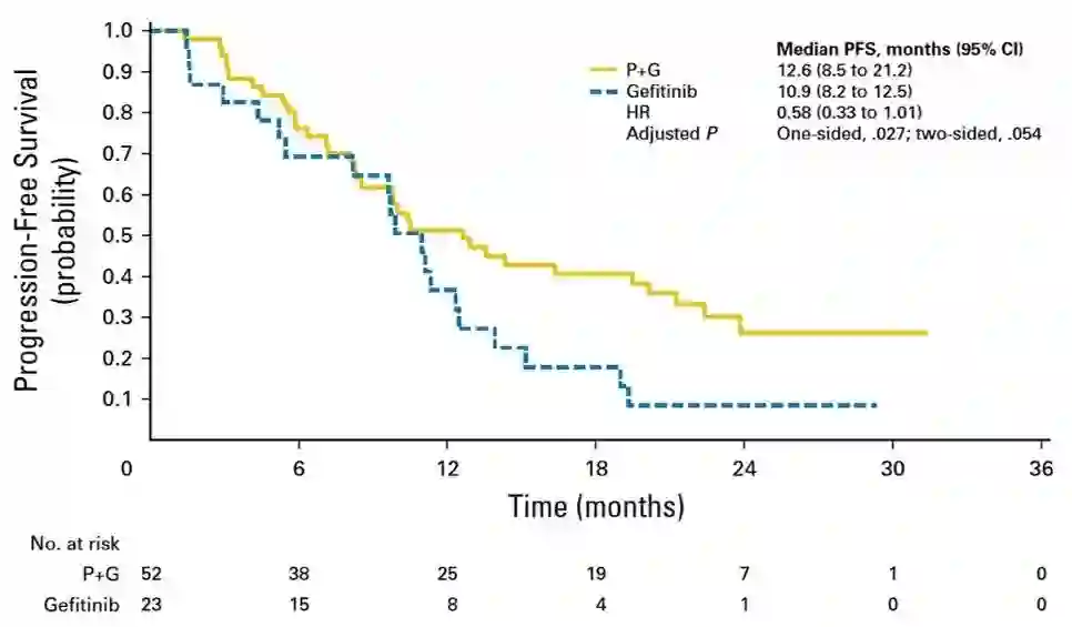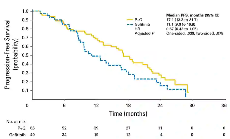 2012年2月至2013年8月,共有232例患者入组,191例患者被随机分配到G+P组(126例),G组(65例)。G+P联合组的中位PFS相对G单药组显著延长近5个月,16.2 m(95% CI, 12.6-18.7)vs 11.07 m(95% CI, 9.7-13.8),疾病进展或死亡风险显著降低了33%,P=0.009。G+P联合组的OS为43.4个月(95% CI,33.4-50.8),G组的OS为36.8个月(95% CI, 26.7-42.6),G+P组的死亡风险降低了23%,P=0.105。另外PFS的亚组分析显示,包括常见EGFR突变亚型亚组(19、21外显子突变)在内,在很多其他亚组也都一致地显示了G+P组的PFS获益。此外两组ORR相当,而联合治疗组的总缓解期(DOR)在数值上较单药组延长4.1个月。