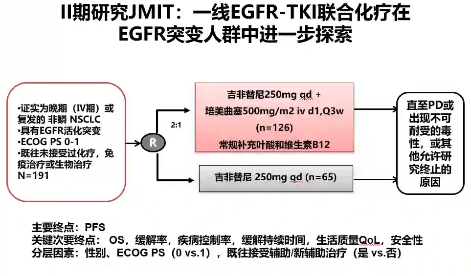 JMIT研究:JMIT研究是由程颖教授牵头的一项在东亚人群中进行的随机、多中心、开放、平行对照的Ⅱ期研究,于2016年发表在JCO杂志,2018年ESMO大会公布了JMIT研究更新的PFS数据和最终OS结果。主要目的为评估吉非替尼+培美曲塞单药化疗相对吉非替尼单药一线治疗能否延长EGFR突变晚期NSCLC患者的PFS。次要观察终点包括OS、ORR、DCR、缓解持续时间、Qol、安全性。入组患者为初治或复发的、EGFR敏感突变的Ⅳ期非鳞NSCLC患者,ECOG PS 0-1,以2:1的比例随机分配到吉非替尼(250 mg/d)+培美曲塞(500 mg/m2,q3w)联合治疗组(G+P)和吉非替尼(250 mg/d)单药治疗组(G),两组治疗均进行到出现疾病进展或不能耐受的毒性为止。