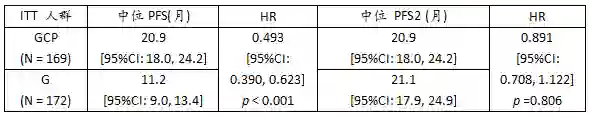 至2017年9月观察到预先计划需要的PFS2事件数。ITT数据集包括344名患者,且两组患者基线特征均衡。GCP联合方案相对于G单药方案可显著改善患者的PFS(20.9m vs 11.2m,HR:0.493,P<0.001),但PFS2在两组之间没有差异。OS(G药组101事件数,GCP组83事件数)分析显示GCP组患者的中位生存时间长于G药组(52.2个月vs 38.8个月,HR:0.695,P=0.013)。虽然GCP方案未能证明其在PFS2中的优势,但该方案会延长患者的无进展生存期和总生存期。