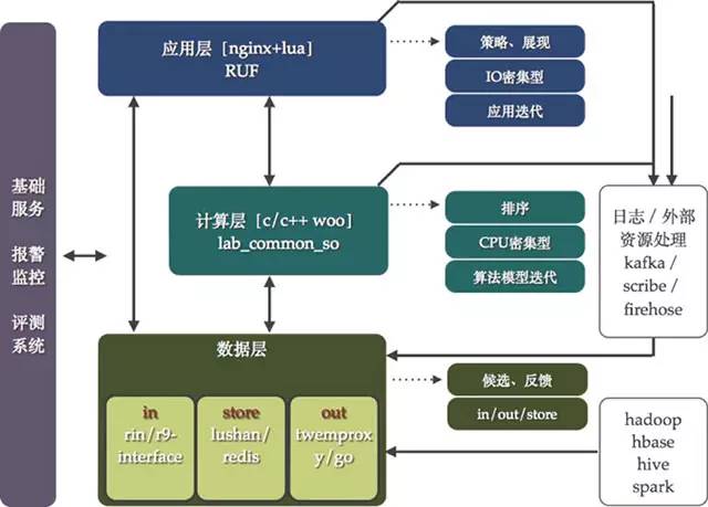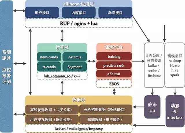 数据层:主要承担推荐的数据流以及存储工作。数据层的工作主要是解决数据的IN/OUT/STORE问题。其中IN数据如何进入系统,OUT表示数据如何访问,STORE表示数据如何存。当在进行数据层规划的时候,又分析了微博推荐的数据特点,可以将其分为两类:静态和动态。静态数据的定义为: 更新需要全量同时频次较低的大规模数据;动态数据的定义为:动态更新同时频次较高的增量数据。这样在IN/OUT/SOTRE的大方向下,同时区分对待静态和动态数据,产生了RIN/R9-interface、redis/lushan、tmproxy/gout代理的工具或者框架。在这里展开讲一下,RIN支持数据动态数据的接入,通过web服务的方式接收数据,后端使用ckestrel进行队列管理,辅以多服务集群的消费框架,使用者只需要进行自己业务的开发即可快速上线消费动态数据。R9-interface处理静态数据的接入,推荐的大量静态数据来源于Hadoop集群的运算,r9-interface框架勇来解决静态运算[MR、HIVE SQL以及SPARK 运算]的通知、管理以及数据载入。针对推荐数据的存储,动态数据大量使用了redis集群,静态数据则使用了lushan集群。对于lushan这个工具在团队开源项目中也包含了:https://github.com/wbrecom/lushan。tmproxy/gout用来解决数据的OUT问题,gout是一个代理中间件,用来处理推荐中对于数据的动静结合访问的需求,减少业务对于后端数据变化带来的影响。