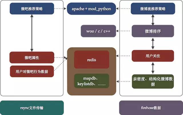 如图4所示,我们试图将每个项目的架构能够在图中表达出来,在真正的实施过程中,每一个项目负责人会选择使用apache+mod_python作为服务架构同时,使用redis作为存储选型。在一些特定的项目中,引入了复杂运算从而诞生了c/c++的服务框架woo;同时,对于数据的存储要求特型化的项目中又自己研发了一系列的db,比如早期存储静态数据的mapdb,存储key-list的keylistdb等等。当然,在部署中会比下图更加随意一些,一个项目几台服务器部署好微博服务提供http请求,然后再找几个服务器安装redis作为数据支撑,来源数据和业务方定好规则使用rsync传输就OK了,大部分策略在python中实现。