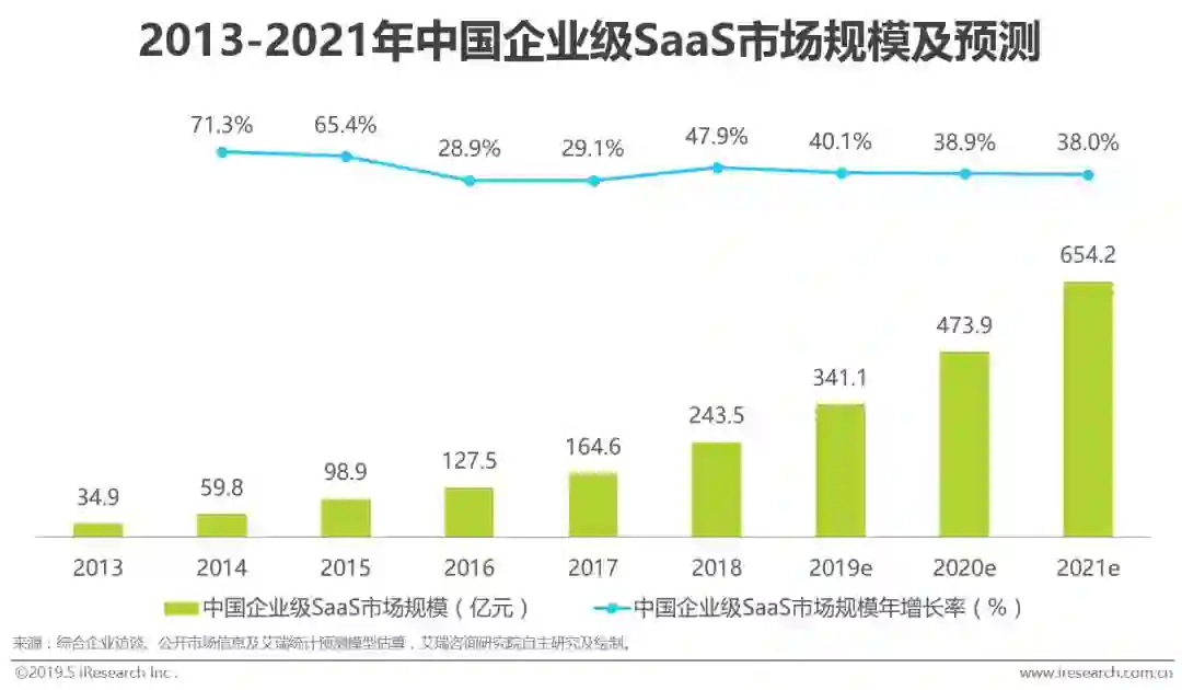 2018年中国企业级SaaS市场规模为243.5亿元,较上年增长47.9%。在经历了短暂的爆发式增长后,SaaS市场体量快速跃升,随后年增长率在2016年到2017年间回落明显。进入到2018年,资本市场对SaaS的态度趋于理性,客户对SaaS的认可度进一步提升,同时各细分赛道的领先厂商在商业化的探索上愈发成熟,SaaS市场增速再度上扬。预计未来三年内中国企业级SaaS市场将保持39.0%的年复合增长率,到2021年整体市场规模将达到654.2亿元。