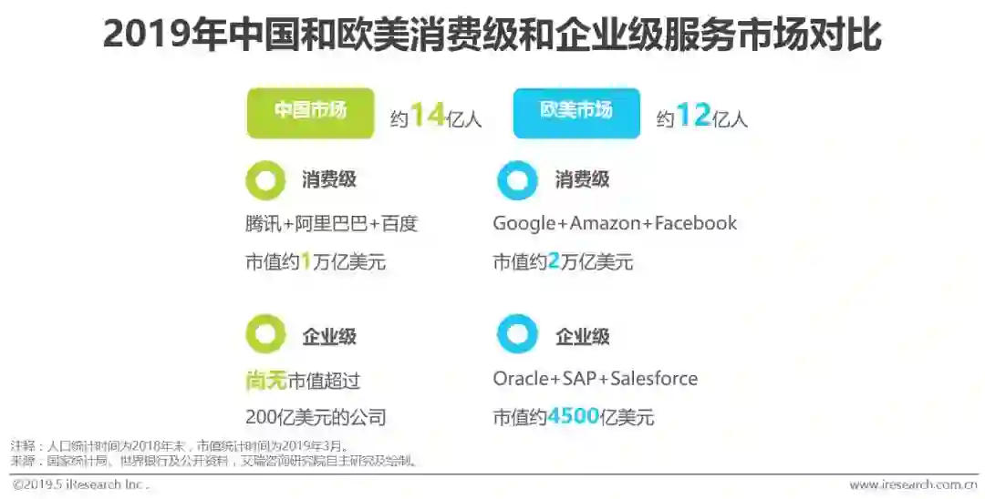 美国CRM SaaS公司Salesforce一直以来被作为全球SaaS行业的标杆。2018年,Salesforce市值首次突破千亿大关,从市值500亿美元到1000亿美元,它仅用了不到三年时间。具有打造“中国版Salesforce“野心的中国SaaS厂商不在少数,但至今尚未出现任何一家能够望其项背。事实上,不仅仅是在SaaS行业,即使是放大到整个企业服务市场,中国厂商的市值都远远落后于欧美市场,和消费级服务相比有极大的成长空间。