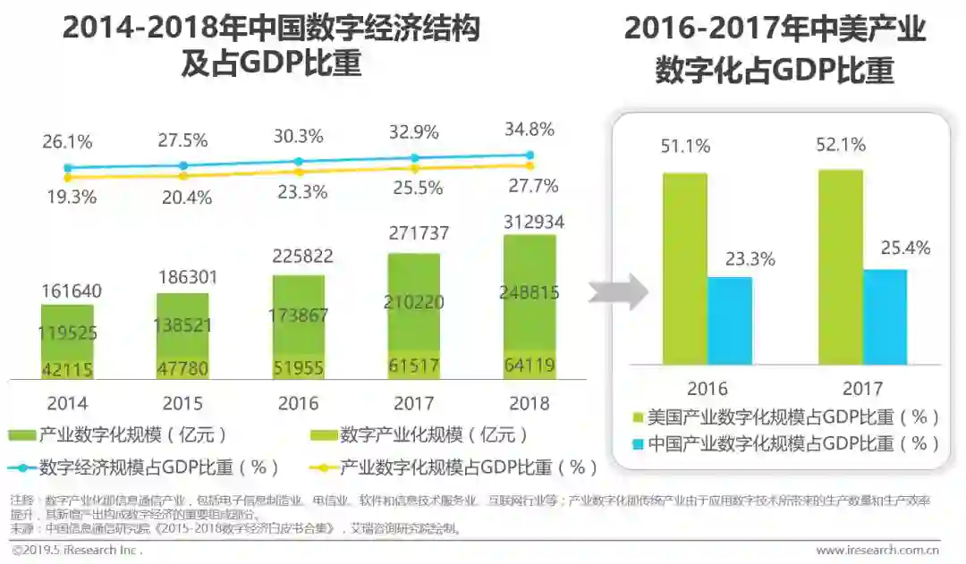 根据中国信通院数据,2018年中国数字经济总量超过3.1万亿元,占GDP比重达到34.8%,数字经济内部结构持续优化,产业数字化规模接近2.5万亿元。尽管数字经济的作用正在加速由IT、互联网等信息通信产业向其他产业传导,但能够看到的是,中美产业数字化规模占GDP的比重依然有近一倍的差距,难以在一朝一夕就追赶上。在中国SaaS市场巨大的潜在空间之下,企业信息化整体水平的提高、对软件的付费意愿和SaaS订阅模式习惯的培养都需要时间,2B市场不会出现像2C市场一样的爆发式增长,长路漫漫,仍需砥砺前行。