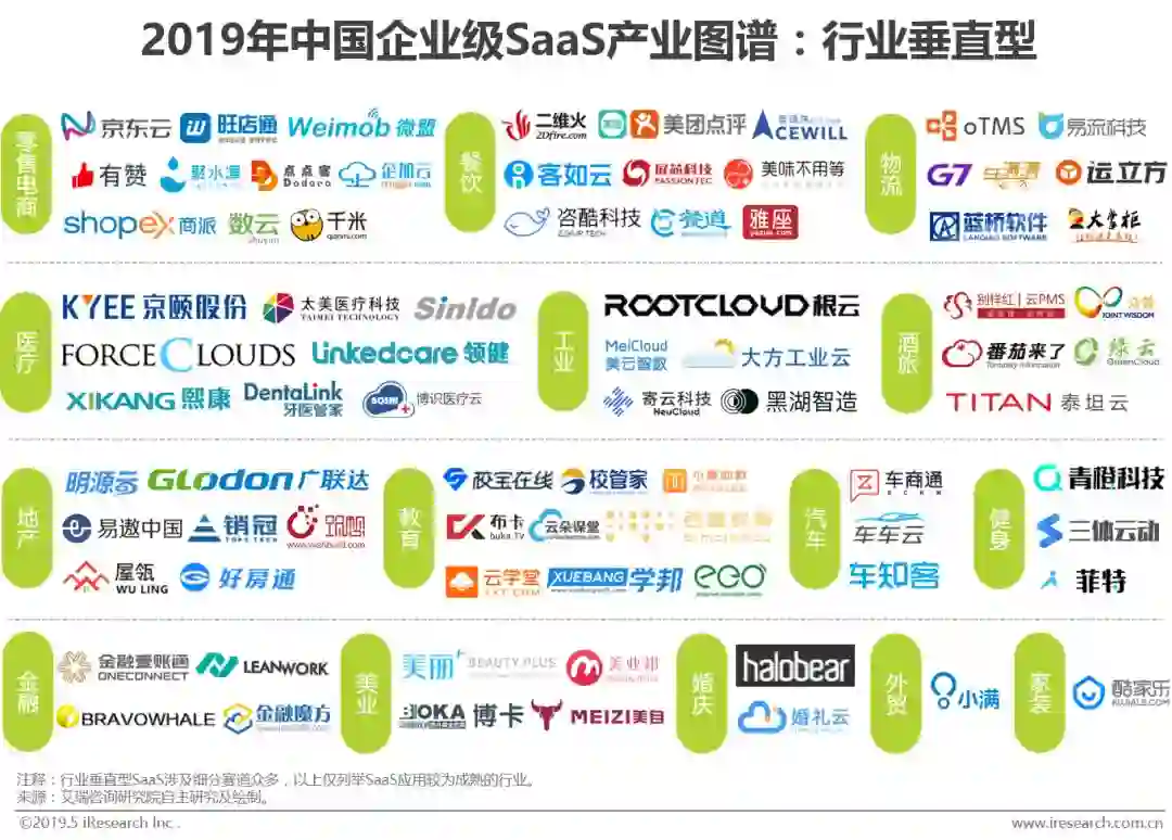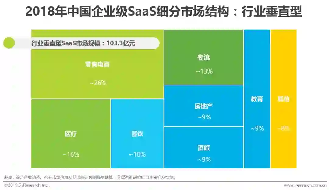 2018年中国行业垂直型SaaS市场规模达到103.3亿元,整体规模略小于业务垂直型SaaS,但年增长率更高为56.6%。其中,零售电商SaaS市场规模最大,约占行业垂直型SaaS的26%,受益于新零售、智慧零售、无界零售概念的兴起,零售电商SaaS年增长率达到66.2%。医疗、物流SaaS市场规模紧随其后,占比约为16%和13%。目前,行业垂直型SaaS主要出现在行业性需求强且与互联网结合更紧密的领域,大量传统行业的SaaS渗透率依然有很大提升空间。