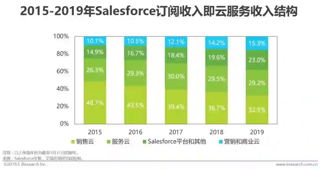 自2007年Salesforce推出PaaS平台以来,其应用市场平台AppExchange汇集了超4000款预集成的应用程序,与PaaS平台相关的收入占云服务收入的比重增长到2019财年的23.0%。Salesforce通过搭建PaaS开放平台扩展和完善自身功能的举措大获成功,因此为诸多国内SaaS厂商所效仿。2014年左右,CRM、OA协同等领域的领先玩家开始基于自身垂直产品跨界打造移动办公平台。背靠阿里和腾讯的钉钉和企业微信以企业级IM强势切入,在短时间内实现大规模扩张,竞争空间迅速收窄导致不少跨界玩家发展受阻。从目前的市场表现来看,国内尚未出现类似Salesforce体量的PaaS平台,平台中立性、平台与开发者的利益分配以及厂商间的数据打通等诸多问题仍有待解决。