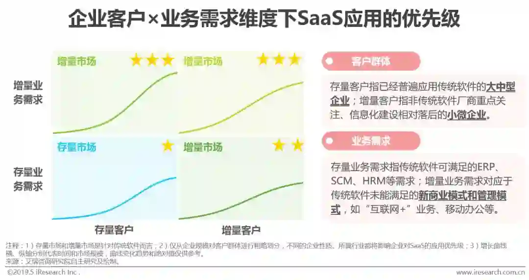 SaaS赛道众多,各细分市场间的差异来自于企业客户应用SaaS的优先级,总体而言增量市场的应用将先于存量市场。从客户群体来看,小微企业对应的增量市场被SaaS激活,其市场主体数量庞大,决策链条相对简单,高性价比的SaaS模式率先迎来快速增长,其中创新型业务的效益更加立竿见影,增长更快。大中型企业对SaaS的态度略显谨慎,但在创新型业务上已经开始表现出对SaaS的偏好,因其付费意愿和能力更强,大中型企业对应的潜在市场空间预期将高于小微企业。针对传统型业务,大中型企业在短期内没有动力替换使用中的传统软件,因而位于图中左下角的市场将呈现出相对缓慢、渐进式的存量替换。