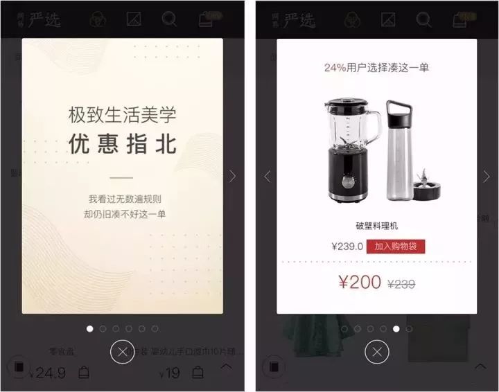 主要展示哪些商品组合购买优惠力度最大,被选择百分比的显示。目的是为了减少用户的思考时间,不用去思考如何组合才有最大的优惠幅度。转化率有了明显的提升。