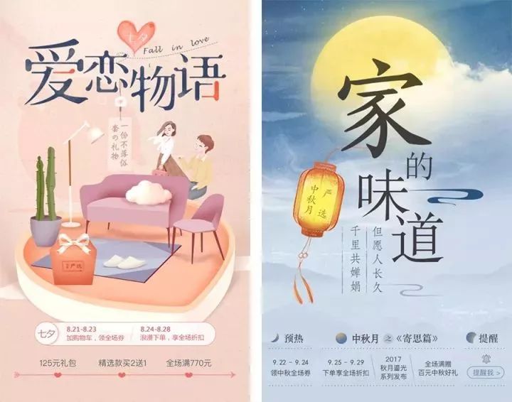 随着产品线的不断丰富,最早的商品库为5个类目,增加到现在的10个类目,从最早的日式小家居用品,到现在新增了很多美式家具,智能电器,志趣周边等。那么原本的一些视觉风格可能不足以囊括所有的商品特性,同时用户也会有视觉疲劳。所以设计风格上从日式性冷淡风,需要慢慢增加了很多更符合品类气质和节日氛围的风格,用更为贴切的视觉语言来表现商品特性。当然设计师还是应该在品牌定位下,去尝试更多的可能性,而不是完全脱离。