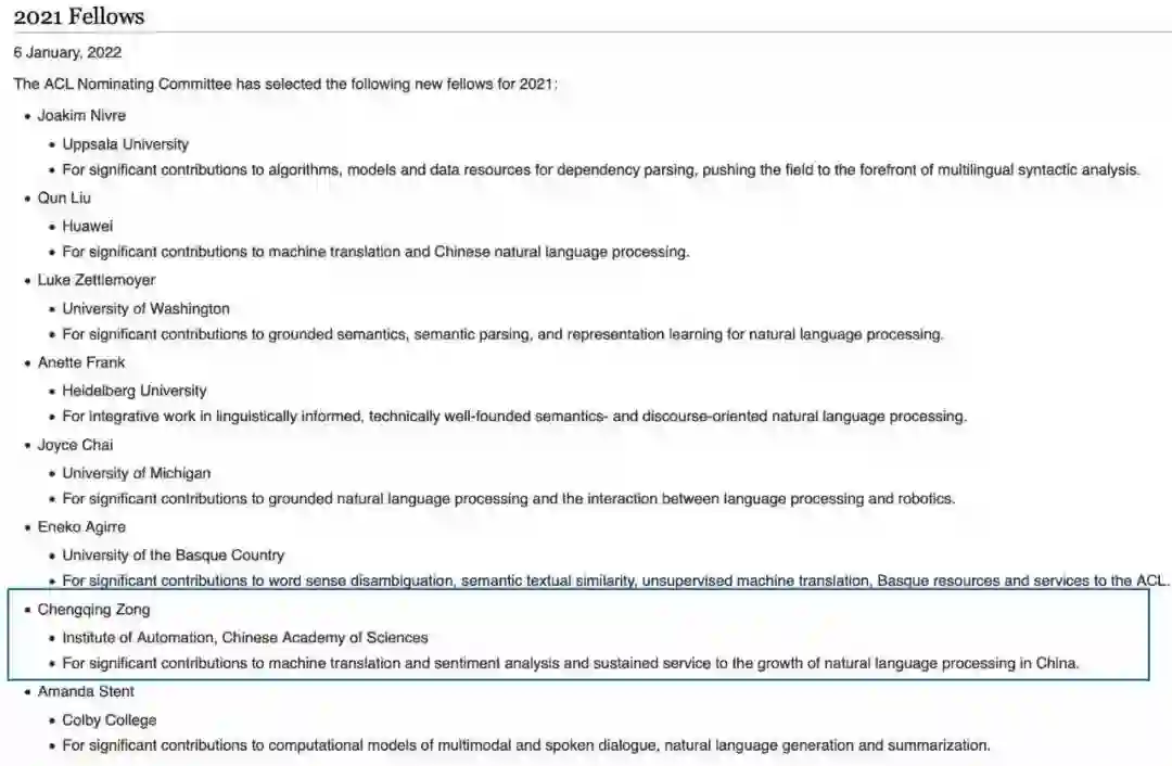 1月6日,国际计算语言学学会(Association for Computational Linguistics, ACL)公布了2021年度新增选的会士(Fellow)名单。宗成庆研究员因在机器翻译和情感分析领域的卓越成就和对中国自然语言处理技术发展做出的贡献当选ACL Fellow。