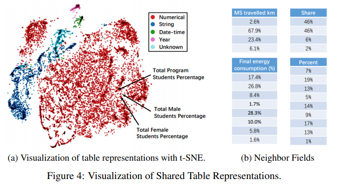 该实验从验证集中随机选择 3039 个表(包含 20000 个字段),通过 t-SNE 进行可视化,用来理解共享表表示编码器生成的嵌入如何工作。