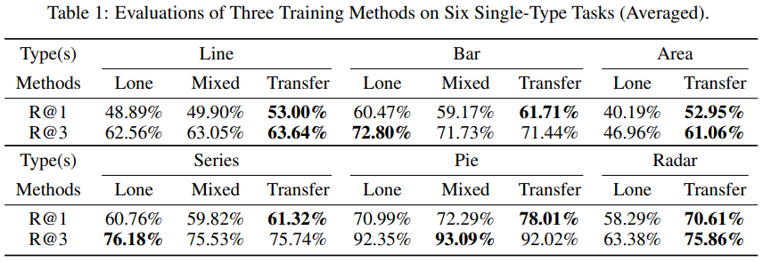 评价结果如表 1 所示。混合和迁移范式(Transfer)通常比单独训练 (Lone) 和仅混合模式(Mixed) 效果更好。特别地,Transfer 的评价标准 R@1 超过了其他两种方法。