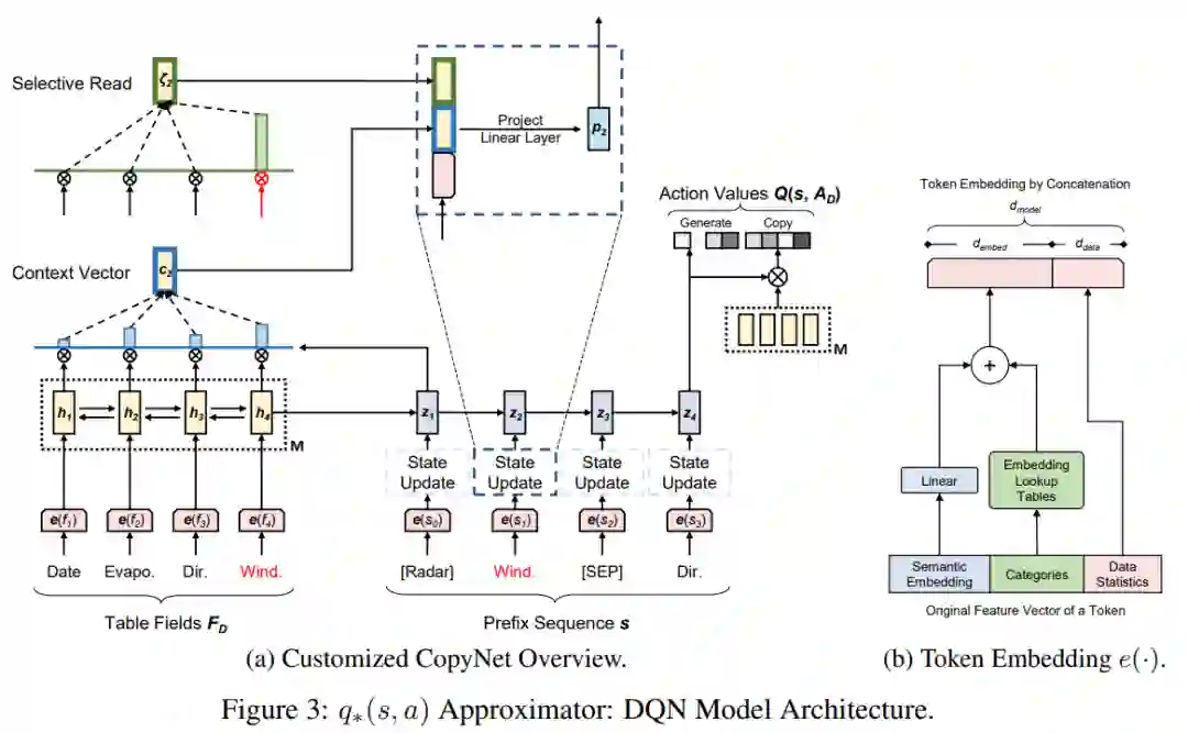 对于涉及从表中选择数据字段以填充模板的结构化预测问题(生成分析操作序列),该论文设计了具有复制机制的深度 Q 值网络(Deep Q-value Network, DQN)。DQN 的编码器部分学习表表示,而解码器部分学习序列生成;