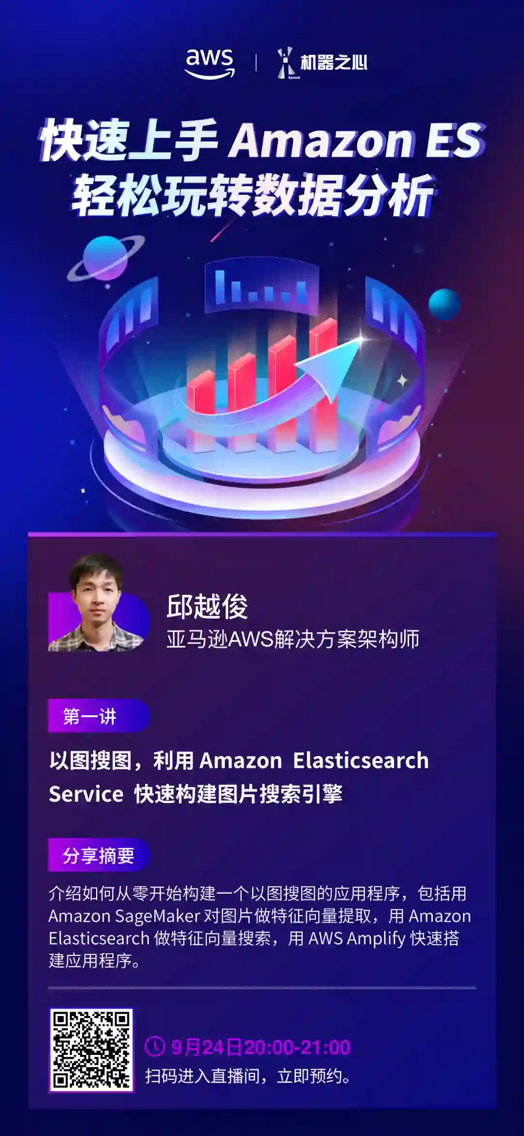 亚马逊AWS解决方案架构师邱越俊将于9月24日带来一场live coding,利用Amazon Elasticsearch Service,从零开始构建一个以图搜图的应用程序,包括用Amazon SageMaker对图片做特征向量提取,用Amazon Elasticsearch做特征向量搜索,用AWS Amplify快速搭建应用程序。