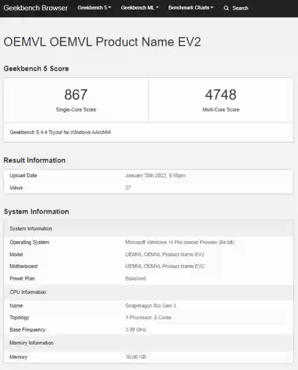 Geekbench 上出现了几个基准测试,它们都以“OEMVL OEMVL Product Name EV2”的名称出现,根据外媒 WinFuture 的说法,这些是新的 Microsoft Surface 的首次试运行,该设备很可能是下一代 Surface Pro X,虽然产品名称无法确认它是否是新的 Surface Pro X,但“EV2”暗示它是设备验证测试(EVT)原型。