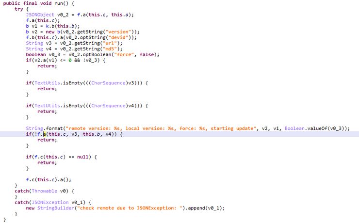 此恶意SDK集成在应用中的那部分代码没有提供实际功能,其在被调用后会定时上报设备相关信息,获取动态子包的下载链接,下载子包并加载调用。然后由子包执行相应的恶意行为。