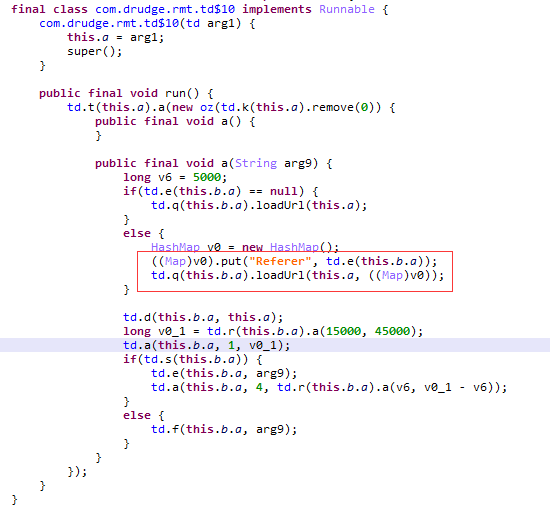 stat-impl.jar子包被加载后,线程com.drudge.rmt.g会被启动,其作用主要是用来联网获取刷量任务,并调度任务的执行。