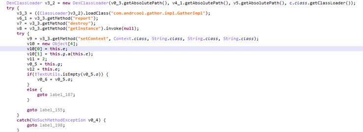 此sdk代码较少,没有什么实际的功能。其在被加载调用后,会设置定时任务,每隔3600秒(1小时)启动GatherService,上报设备相关信息,获取动态子包__gather_impl.jar的下载链接