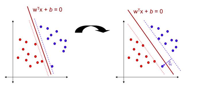 在上面的数据类中,有一个蓝色的异常值。如果我们对该数据集应用硬间距分类器,我们将获得左边图所示的小边距的决策边界。为了避免这些问题,最好使用更灵活的模型。目的是在保持两条线之间距离尽可能大的情况下找到一个良好的平衡,并限制边际违规(即,最终在两条线中间的距离甚至错误的一面的情况),这称为软间距分类器。如果我们对该数据集应用软间距分类,我们将获得比硬间距分类更大的确定边界,这在右图中显示。