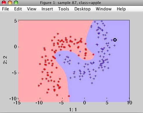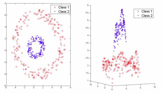内核是计算两个向量X,Y的点积的一种方法和在某些(可能非常高的维度)特征空间中,这就是为什么内核函数有时被称为“广义点积分”。假设我们有一个映射:φ:Rn→Rm,这使我们的矢量在Rn到某些特征空间Rm。然后数量积X,Y在这个空间里面是 φ(x)Tφ(y)。一个内核是一个函数K相当于数量积:k(x,y)=φ(x)Tφ(y)。内核提供了一种方法来计算某些特征空间中的点积,甚至不知道这个空间是什么。