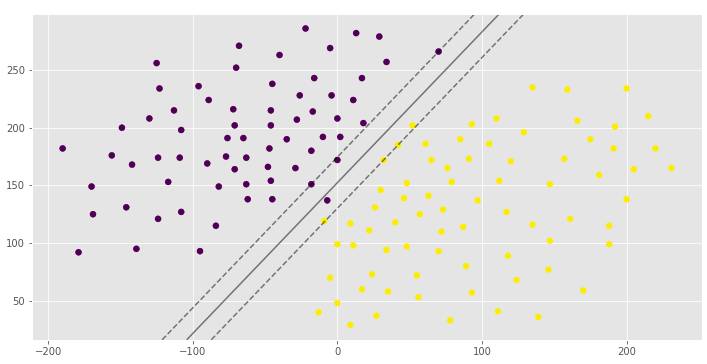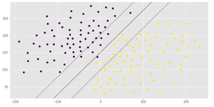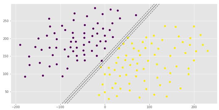 plt.rcParams['figure.figsize'] = (12, 6)style.use('ggplot')# Import Datasetdata = pd.read_csv('data.csv', header=None)X = data.values[:, :2]y = data.values[:, 2]# A function to draw hyperplane and the margin of SVM classifierdef draw_svm(X, y, C=1.0): # Plotting the Points
