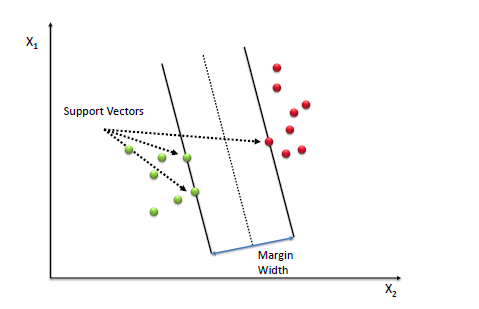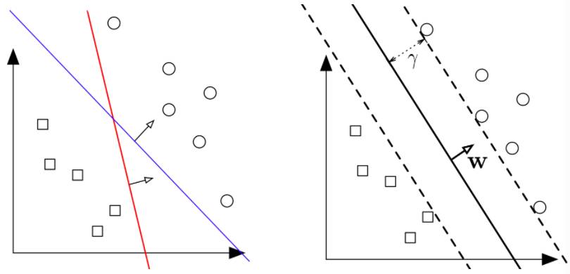 这两个类数据可以用直线(线性分离)轻松分离。左图显示了2个可能的线性分类器的决策边界。SVM模型其实就是关于生成正确的分界线(在较高维度称为Hyperplane)。在左图中,我们可以看到数据分类非常好,尽管红线对数据进行了分类,但在新的数据实例中可能无法很好地执行。我们可以画出许多对这些数据进行分类的线,但是在所有这些线中,蓝线可以分隔最多的数据。如果将相同的蓝线显示在右图,这条线(超平面)不仅分离了两个类,而且还保持了最远的相近的训练实例的距离。我们称之为大间距分类器(Large Margin Classification)。