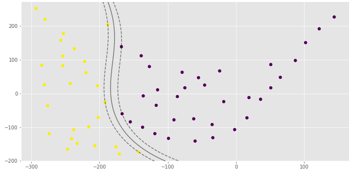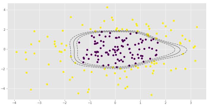 plt.rcParams['figure.figsize'] = (12, 6)style.use('ggplot')X, y = make_gaussian_quantiles(n_samples=200, n_features=2, n_classes=2, cov=3)# Auto gamma equals 1/n_featuresdef draw_svm(X, y, C=1.0, gamma='auto'):