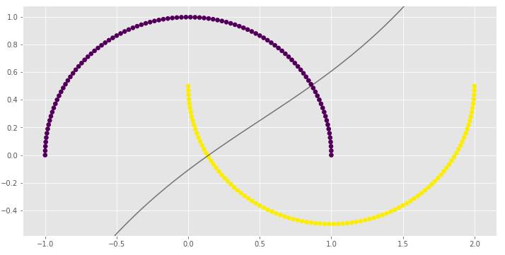 plt.rcParams['figure.figsize'] = (12, 6)style.use('ggplot')X, y = make_moons(n_samples=200)# Auto gamma equals 1/n_featuresdef draw_svm(X, y, C=1.0, gamma='auto'):
