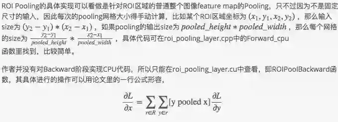 首先需要介绍RCNN系列里的一个核心算法模块,即ROI Pooling。我们知道在ImageNet数据上做图片分类的网络,一般都是先把图片crop、resize到固定的大小(i.e. 224*224),然后输入网络提取特征再进行分类,而对于检测任务这个方法显然并不适合,因为原始图像如果缩小到224这种分辨率,那么感兴趣对象可能都会变的太小无法辨认。RCNN的数据输入和SPPNet有点类似,并不对图片大小限制,而实现这一点的关键所在,就是ROI Pooling网络层,它可以在任意大小的图片feature map上针对输入的每一个ROI区域提取出固定维度的特征表示,保证后续对每个区域的后续分类能够正常进行。