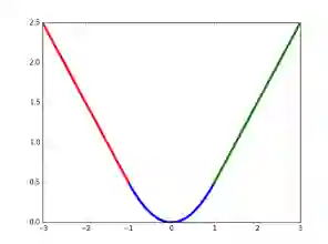 坐标的差距。该函数在 之间间为二次函数,而其他区域为线性函数,作者表示这种形式可以增强模型对异常数据的鲁棒性,整个函数在matplotlib中画出来是这样的