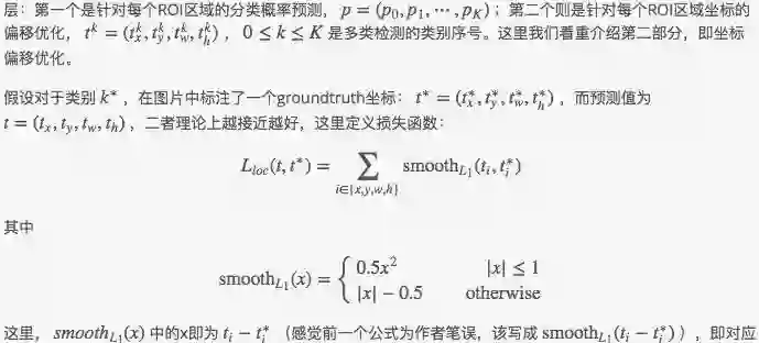 有了ROI Pooling层其实就可以完成最简单粗暴的深度对象检测了,也就是先用selective search等proposal提取算法得到一批box坐标,然后输入网络对每个box包含一个对象进行预测,此时,神经网络依然仅仅是一个图片分类的工具而已,只不过不是整图分类,而是ROI区域的分类,显然大家不会就此满足,那么,能不能把输入的box坐标也放到深度神经网络里然后进行一些优化呢?rbg大神于是又说了"yes"。在Fast-RCNN中,有两个输出