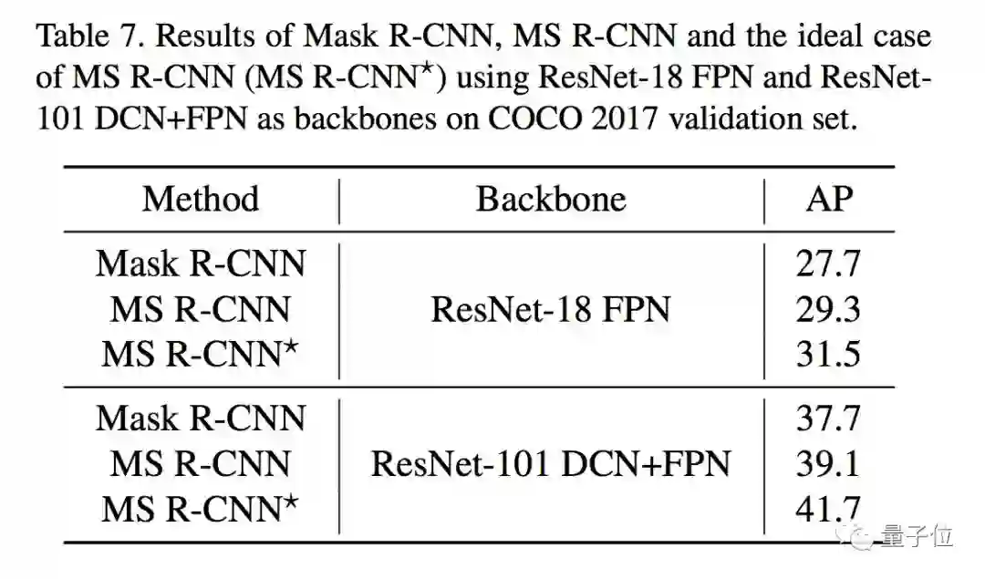 无论基干网络是纯粹的ResNet-101,还是用了DCN、FPN,MS R-CNN的AP成绩都比Mask R-CNN高出一点几个百分点。