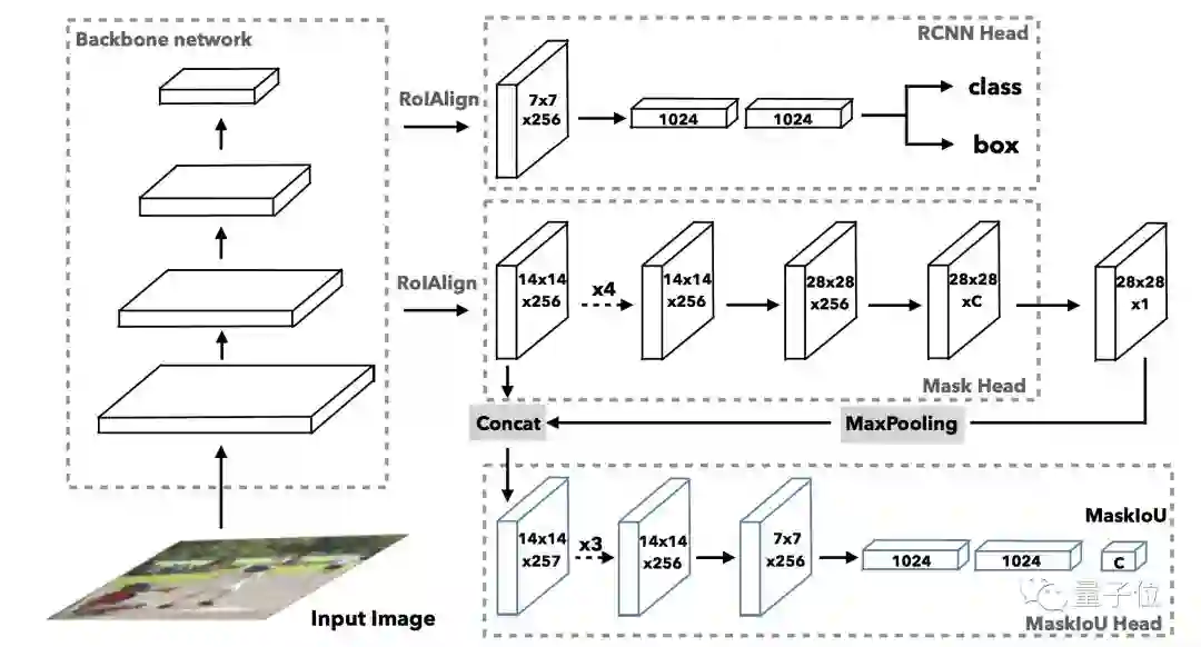 MaskIoU head是在经典评估指标AP(平均正确率)启发下得到的,会拿预测蒙版与物体特征进行对比。MaskIoU head同时接收蒙版head的输出与ROI的特征(Region of Interest)作为输入,用一种简单的回归损失进行训练。