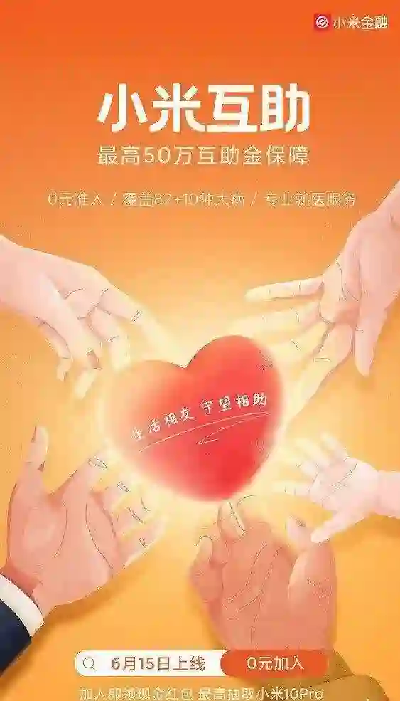 昨日,拥有保险经纪牌照的小米金融宣布将于6月15日上线“小米互助”。据其介绍,“小米互助”0元可加入,最高50万互助金保障,覆盖90多种重疾,具体细节需等待上线后才能明晰。就最高互助金来说,相比蚂蚁金服相互宝最高30万互助金,高出20万;此外,为获取用户,小米金融开启现金补贴,加入用户即可领取现金红包。(界面)