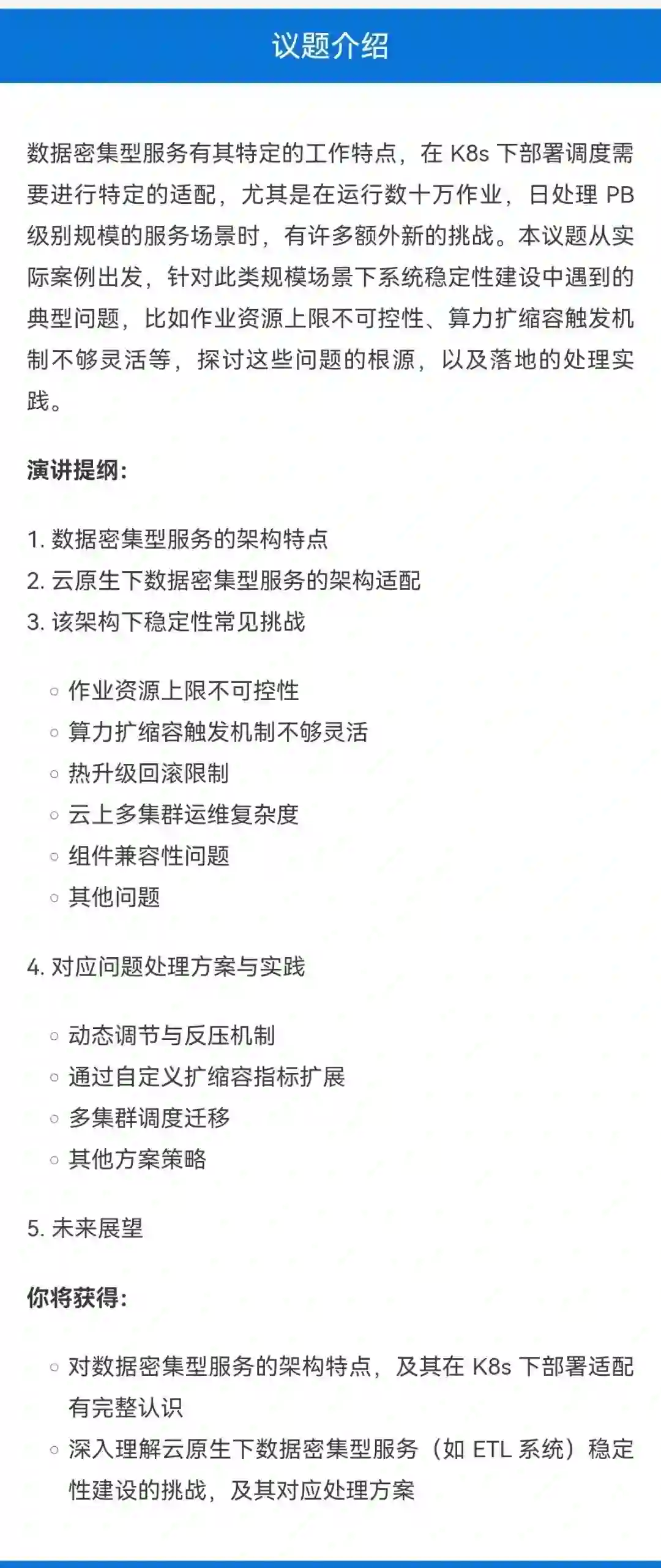 推荐理由:如今,许多服务都是数据密集型服务,它的挑战来自于数据的体量、复杂性和变更速度。在 K8s 下部署调度,数十万作业,日处理 PB 级别的服务场景时,为保证服务的稳定性和效率,有哪些事情是必须做的?有哪些坑容易踩到?我们希望这个议题能对你有所启发。
