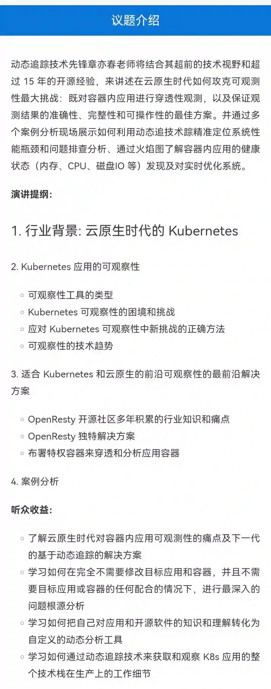 推荐理由:章亦春老师是大名鼎鼎的 OpenResty 作者,是动态追踪技术先锋,这一次,他将远程连线现场,带来他的最新研究,云原生时代如何攻克可观测性最大挑战:既对容器内应用进行穿透性观测,以及保证观测结果的准确性、完整性和可操作性的最佳方案。