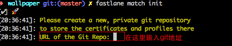 2.在终端运行fastlane match init可以看到需要我们输入giturl地址,我们将地址拷进来即可。