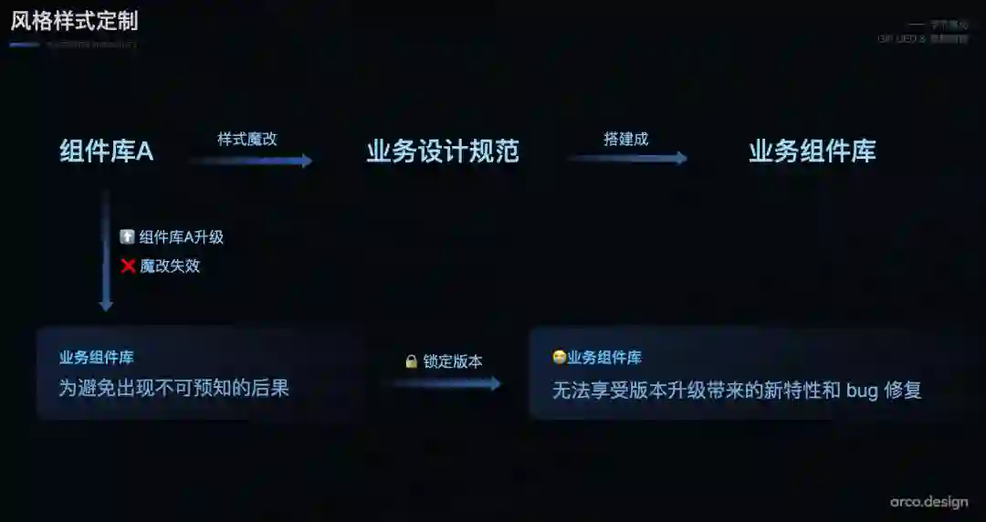 然而,只要涉及到魔改,就不可避免地会遇到升级问题。只要升级底层组件库,就有可能导致样式甚至功能出现出现不可预知的改变,为了求稳,就需要锁版本,锁了版本又没办法享受版本升级带来的新特性和 bug 修复,陷入一个恶性循环的怪圈。