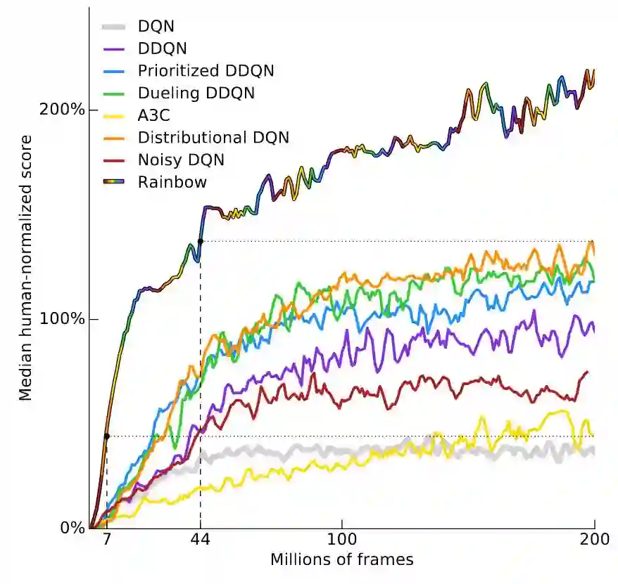 y 轴是「人类性能标准化的中值得分」。通过为 57 个 Atari 游戏中的每一个训练一个 DQN 模型,然后将每个智能体的得分进行标准化,使得人类的性能是 100%,然后将模型在 57 款游戏上的中值得分画出来。RainbowDQN 模型的训练数据达到约 1800 万帧的时候突破了 100% 的阈值。这相当于玩了 83 小时的游戏,再加上训练模型所花的时间。而人类通常能够在几分钟之内学会一款 Atari 游戏。