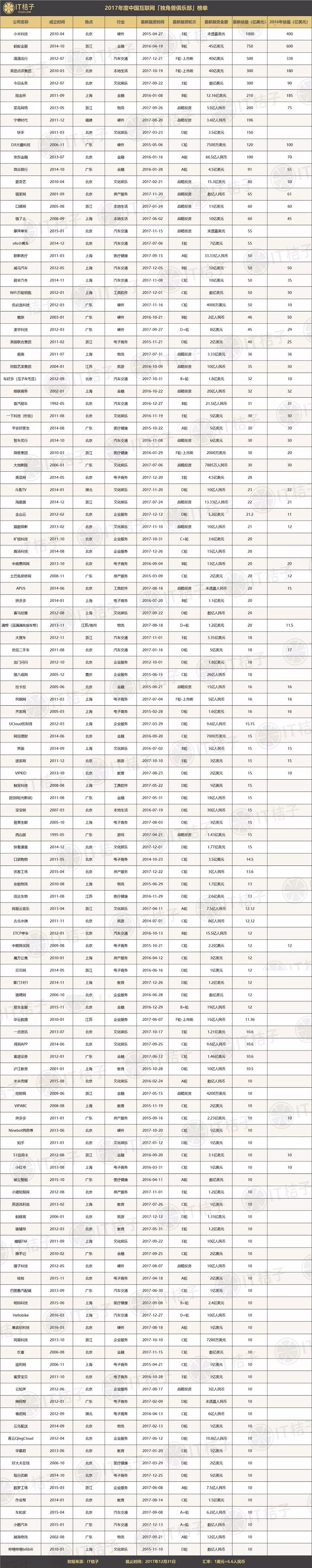 (注:2018 年伊始,就有「自如」和「曹操专车」等公司拿到大额融资,晋级到独角兽俱乐部,我们将放在下一年的独角兽榜单中)
