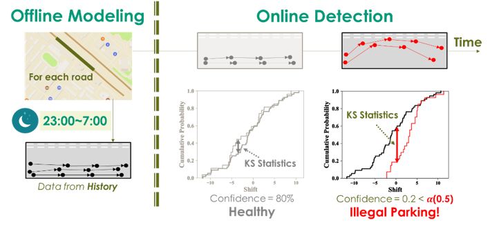 2. 其次,意识到 GPS 误差、骑行习惯多样性引入的单条轨迹难以分类的问题,作者采用了轨迹融合与分布一致性的假设检验,KS 检验。文章解释到,即使 GPS 误差和不同用户骑行习惯会影响单条轨迹,然而一条特定路段上,轨迹点概率分布是不变的。只有在有违章停车发生时,这个概率分布才会受到影响。因此,分类轨迹点分布,比分类单条轨迹要可靠;