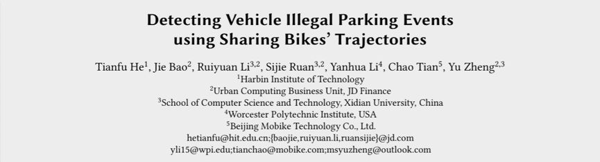 [ 导读 ]智慧城市是近年来非常热门的话题,基于 AI 技术的城市计算的研究也是热点之一。对于构建一个智慧城市来说,拥有海量高质量"活"数据非常关键。近年来兴起的共享单车满足了大量用户的短途出行需求,这些每天运行在大街小巷中,带有智能锁终端的设备,在过去几年中已经收集了大量有价值的"活"数据。现在市场中的先行者们也开始在挖掘这些数据中的价值。在刚刚过去的数据挖掘顶级会议 SIGKDD 2018 中,摩拜与京东金融合作发表了一篇名为"Detecting Illegal Vehicle Parking Events using Sharing Bikes' Trajectories"的论文,该论文通过挖掘摩拜自行车的轨迹数据来检测城市中的机动车违停问题。可以做到在无需任何人力的介入下,达成了全城范围的违停检测,为城市的数据利用发起了一个新的方向。