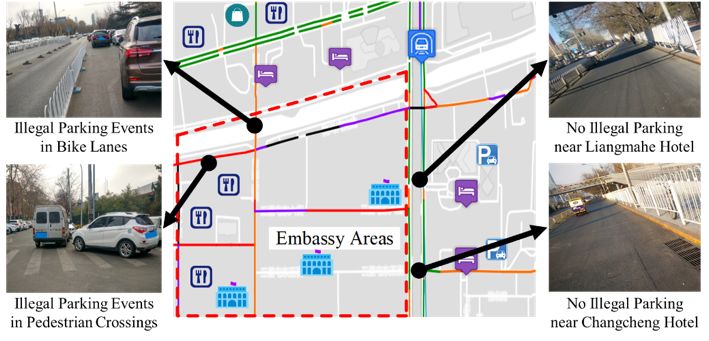 为了更好地评估违停检测算法的优劣,论文作者根据得到的实验结果(路段颜色越深表示违停情况越严重),在亮马桥地铁站附近做了实地考查。作者发现,被检测违停严重的红色框内是大使馆区,上班族较多,且有不少饭店,但区域内缺乏停车场建设,因此,车辆违停现象严重,甚至出现在自行车道、人行斑马线上;相比之下,东边的三环辅路,一路周围空旷,只有两个拥有大量停车位的酒店,极少出现违停。这些考察进一步验证了实验结果的有效性。